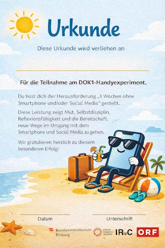 Alle teilnehmenden SchülerInnen haben eine Urkunde erhalten. Eine solche haben sich auch diejenigen verdient, die auch bisher in ihrem Alltag auf ein Smartphone verzichtet haben. Und erfreulicherweise planen viele, zumindest Teile der neuen Routinen bzw. Aktivitäten beizubehalten!